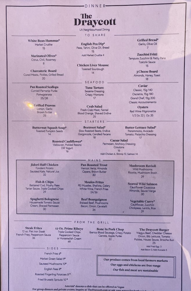 Located in Pacific Palisades, CA, The Draycott is a cocktail bar that offers a wide range of amenities, including vegan options, outdoor seating, and free Wi-Fi. The restaurant has received positive reviews from customers, with praises for its friendly staff, delicious food, and beautiful ambiance. Highlights mentioned by patrons include the Tuna Tartare, Steak Frites, Eggs Benedict with Avocado, and the Wagyu burger. The menu features unique dishes like herb-curated halibut and creamy mac & cheese, creating a diverse and flavorful dining experience. The Draycott's attention to detail in both food preparation and service has left a lasting impression on visitors, making it a must-visit spot for brunch, lunch, or dinner.